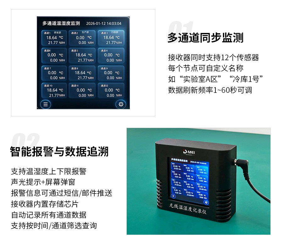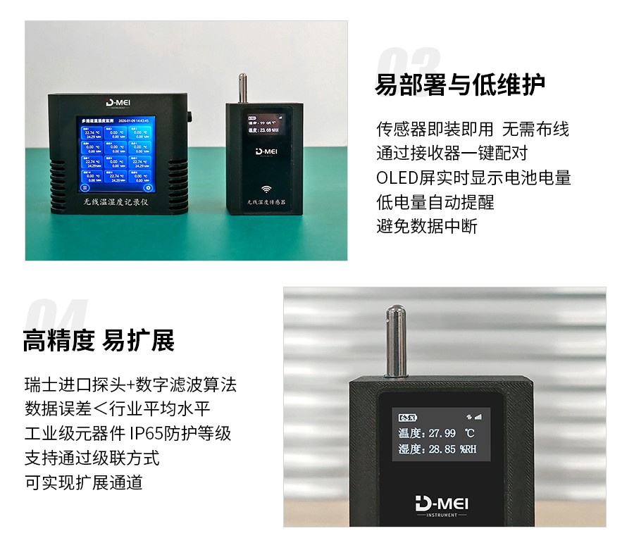 無線溫濕度采集系統(tǒng)是一款高精度、多通道、易部署的環(huán)境監(jiān)測(cè)解決方案,由無線溫濕度傳感器和無線接收器兩部分組成。系統(tǒng)采用瑞士Sensirion原裝溫濕度探頭,結(jié)合2.4G無線通信技術(shù)與工業(yè)級(jí)顯示模塊,支持多只傳感器同步監(jiān)測(cè),適用于實(shí)驗(yàn)室、倉儲(chǔ)、農(nóng)業(yè)大棚、機(jī)房等多場(chǎng)景的溫濕度實(shí)時(shí)監(jiān)控與數(shù)據(jù)追溯。