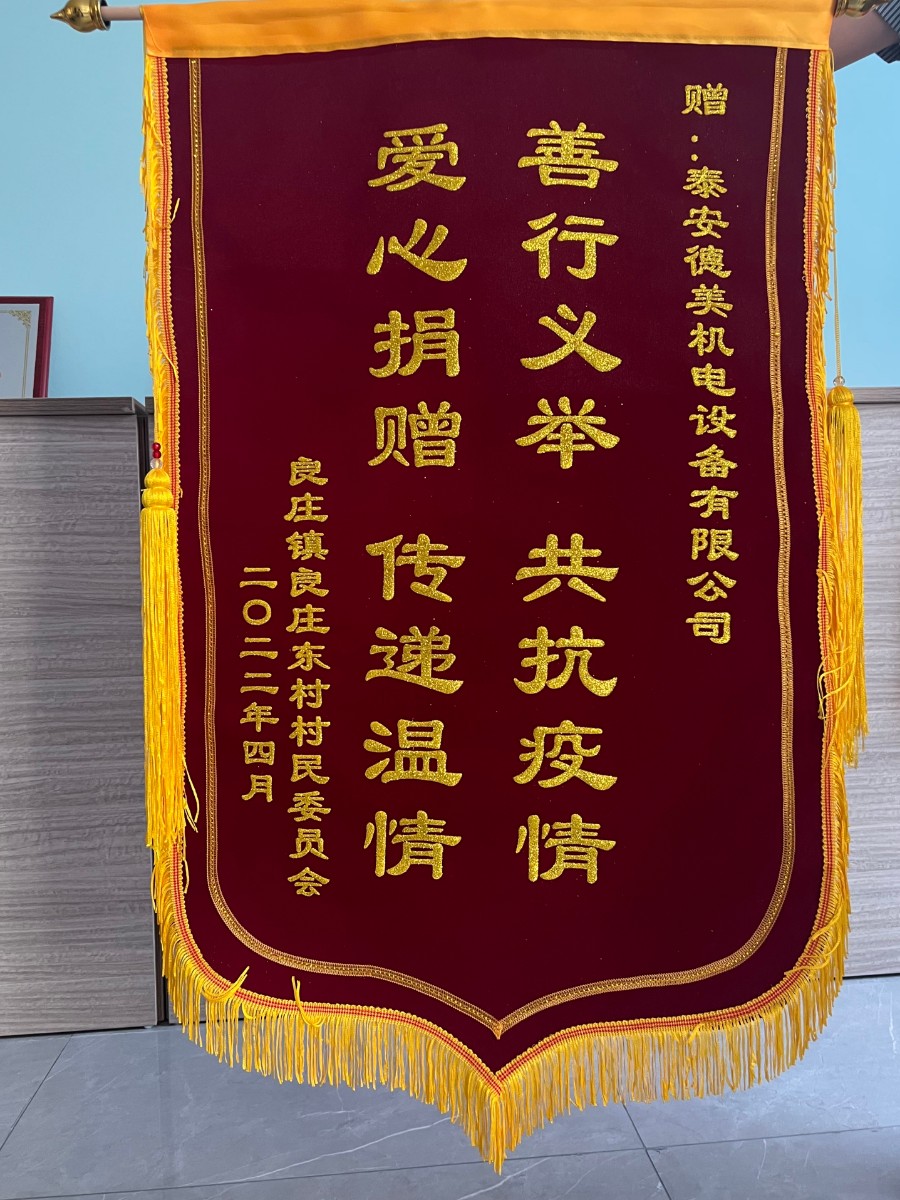 近日,良莊鎮(zhèn)良莊東村村民委員會將寫有“善行義舉,共抗疫情,愛心捐贈,傳遞溫情”的錦旗送到泰安德美機電設(shè)備有限公司,對本次抗擊疫情所做貢獻給予充分肯定!