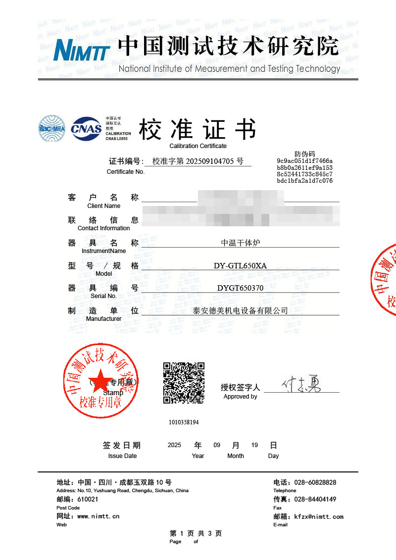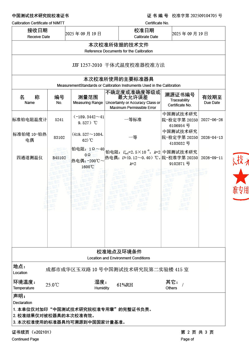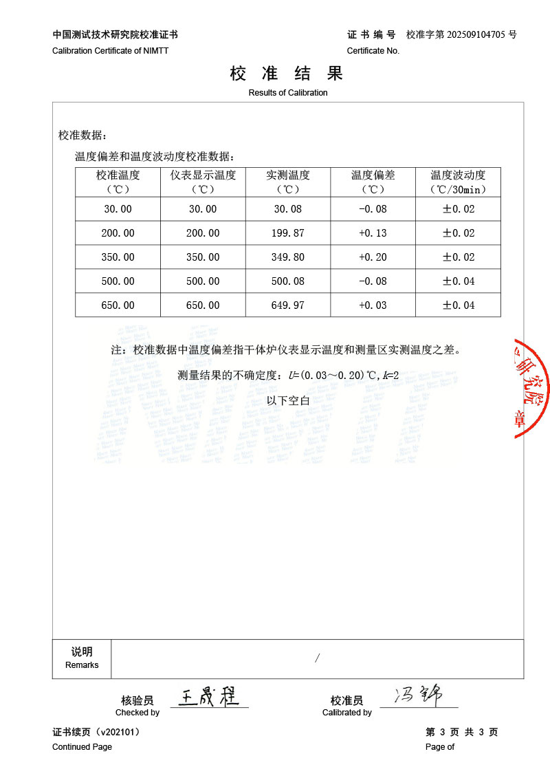 中溫干體爐(30-650℃)校準證書 2025-9-22 本文被閱讀 2024 次