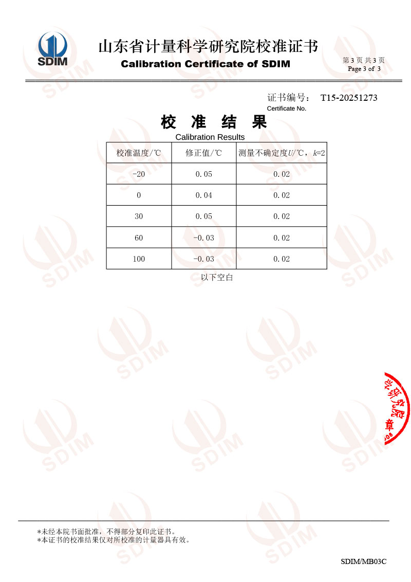 | 上一條:高精度熱管恒溫槽(50-300℃)校準(zhǔn)證書 | 下一條:水三相點(diǎn)瓶凍制與保存裝置校準(zhǔn)證書 |